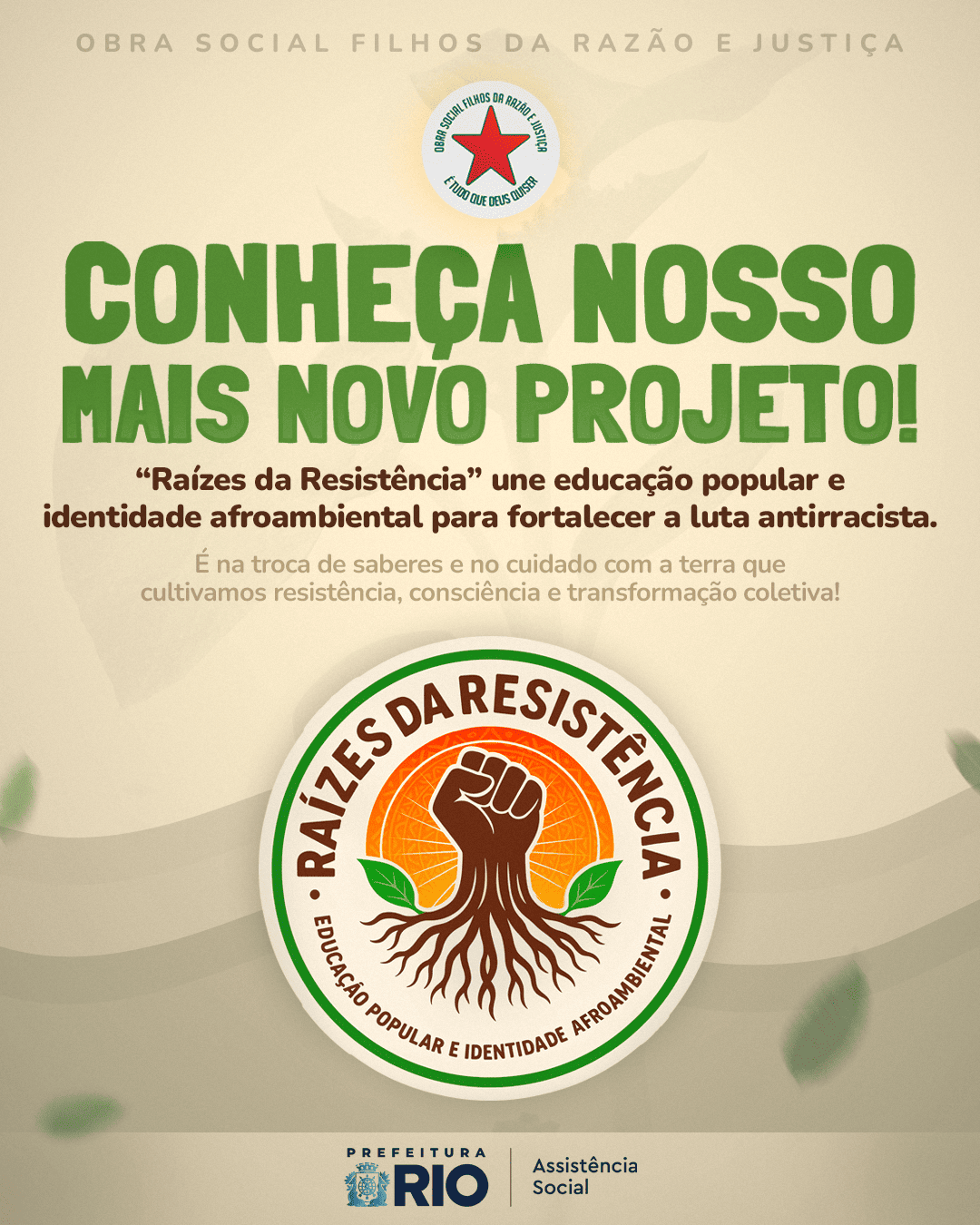 A Obra Social Filhos da Razão e Justiça, em parceria com a Prefeitura do Rio de Janeiro e a Secretaria Municipal de Assistência Social, inicia o projeto Raízes da Resistência, que une ancestralidade, meio ambiente e educação popular.